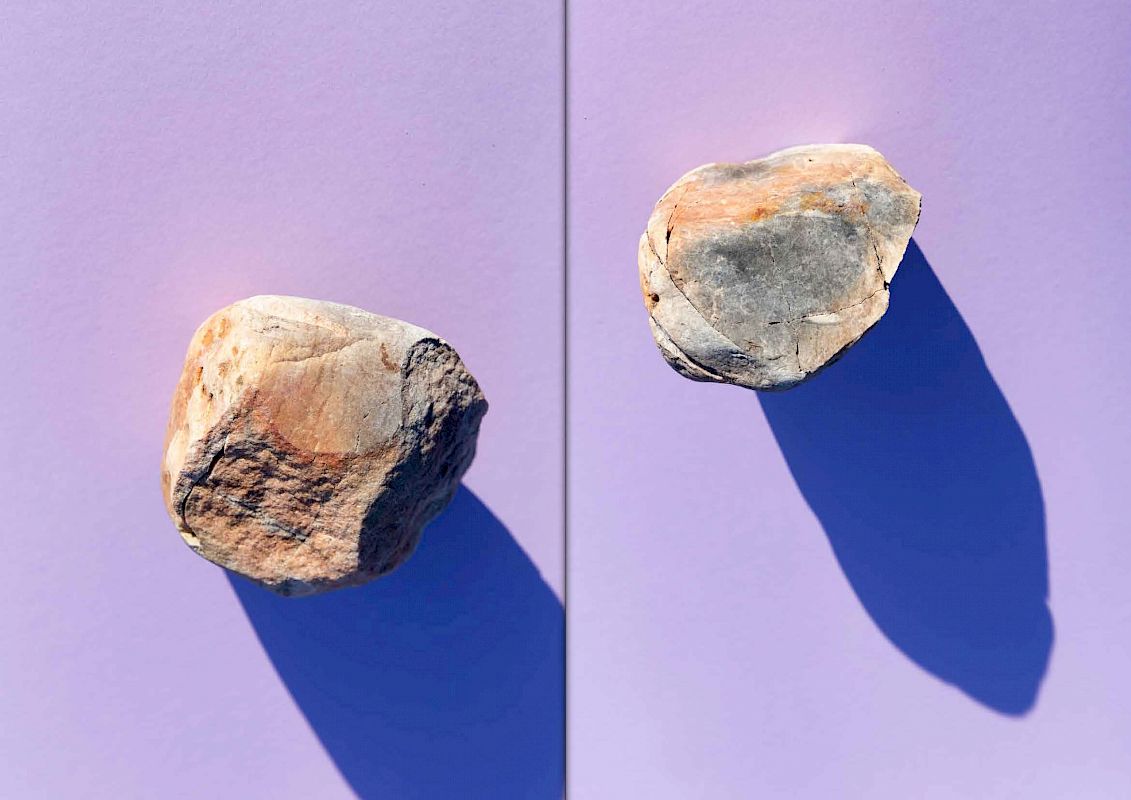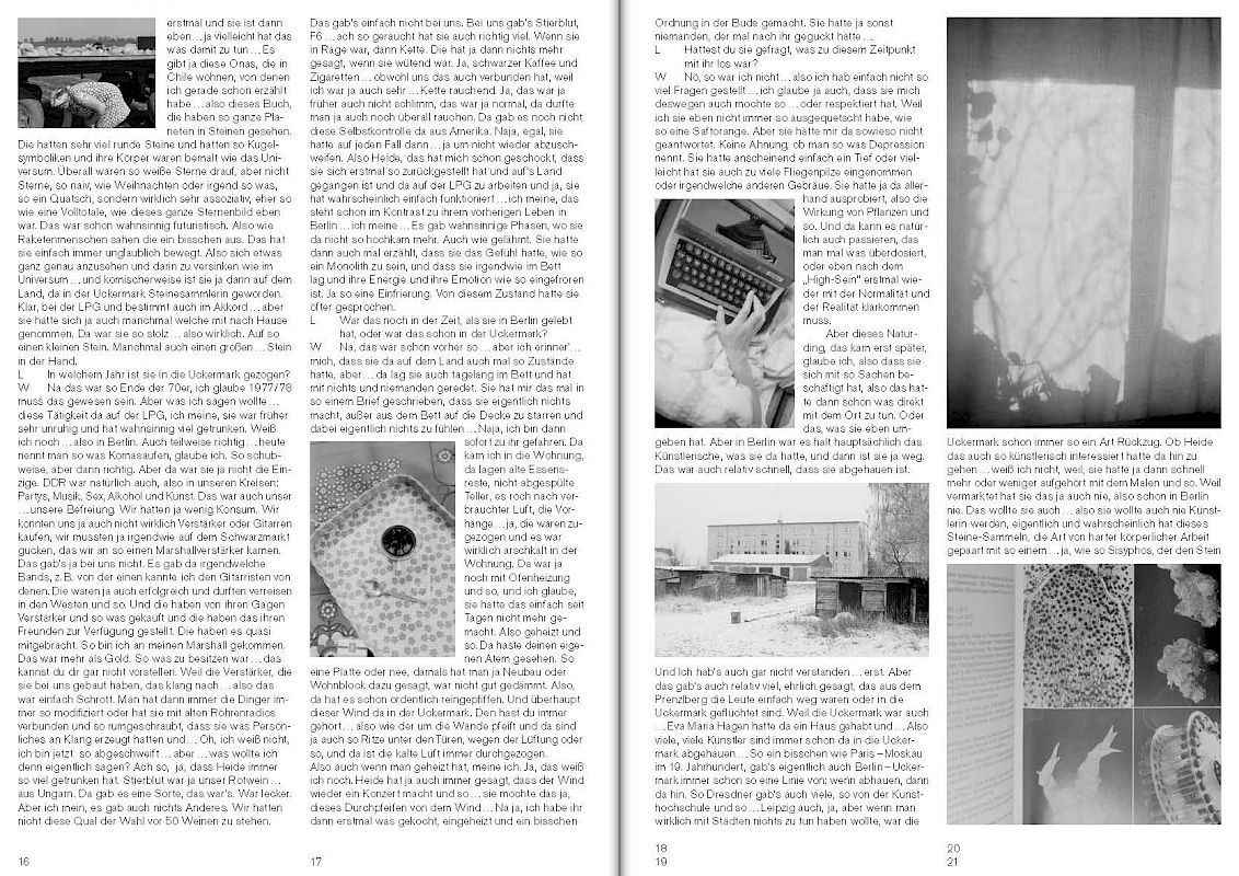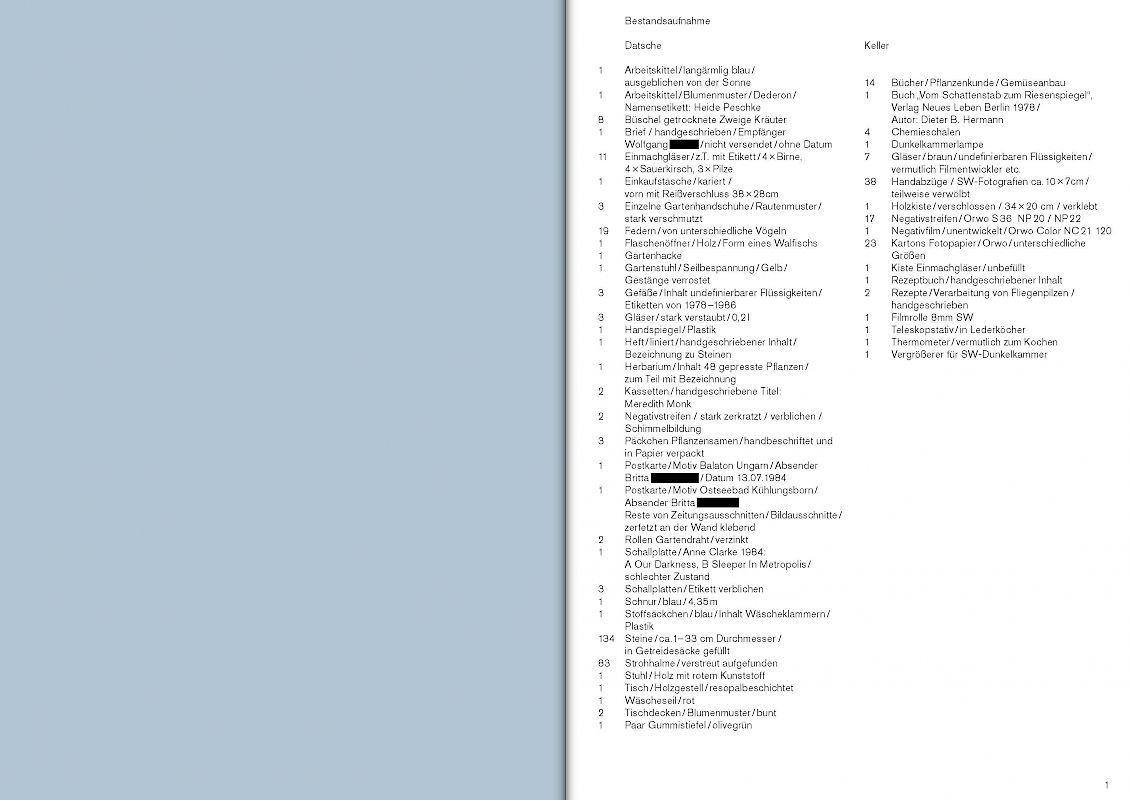 Gefunden wurden die fotografierten Steine, laut einer Bestandsaufnahme in Heide 2 und einem Texttafel an der Wand, in der Datsche des LPG-Wohnblocks. Eine ganze Reihe weiterer Gegenstände ist hier aufgelistet: Schallplatten und Kassetten, Hefte und Einmachgläser, die Ausstattung eines Fotolabors. Es sind Überreste eines vergangenen Alltags, Hinterlassenschaften einer Person, deren Charakterisierung sich allmählich anhand der von ihr gesammelten Dinge herausbildet. Der Blick auf das Leben in dem kleinen DDR-Ort wird anhand der Text- und Bildfragmente aus der Chronik der Gemeinde Groß-Fredenwalde sowie anhand des Gesprächsprotokolls zwischen der Künstlerin Lackner und einem Mann namens Wolfgang zunehmend schärfer gestellt.
