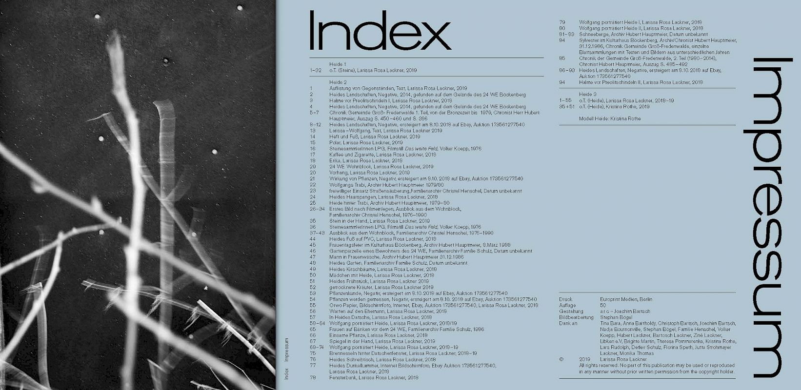 Doch diese Dramaturgie wird immer wieder durch abstrakt wirkende Abbildungen unterbrochen. Im Index, der Heft 2 abschließt, erfahren wir, dass es sich hierbei um Negative handelt, die Lackner im verlassenen Wohnblock fand oder auf Ebay ersteigerte. Doch der Index listet nicht nur vermeintliche Spuren von Heides Existenz auf, sondern enthält auch erste Hinweise auf die verschiedenen Erzählformen und -mittel, die Lackner einsetzt.